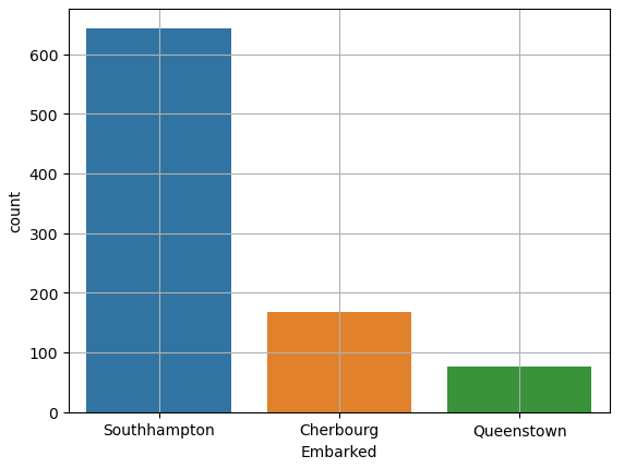 sns.countplot(titanic['Embarked'])