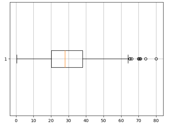 plt.boxplot(temp['Age'], vert = False) # vert = vertical