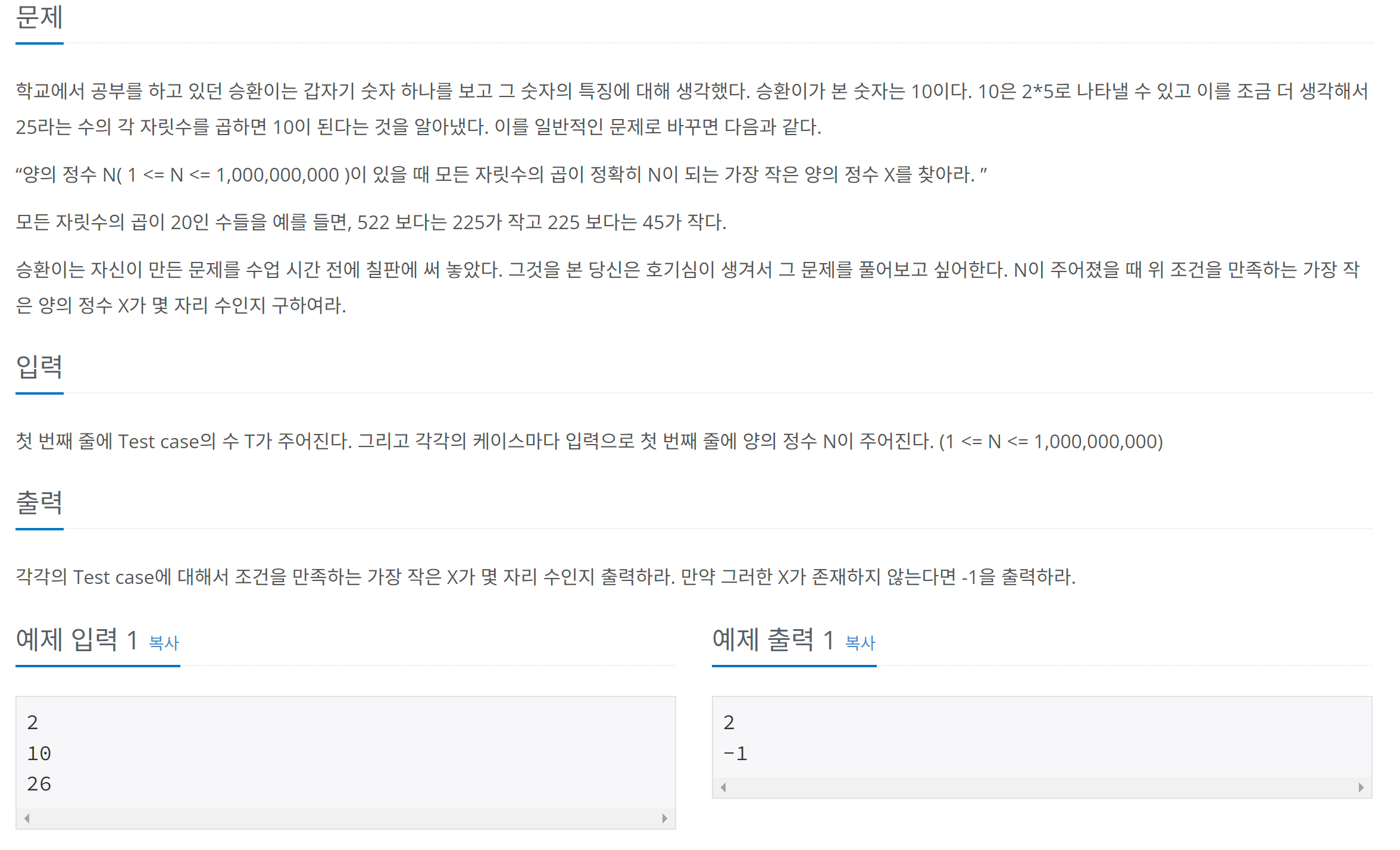 인수를 찾아낸 후에 10 밑의 인수들로만 이루어지도록 해서 숫자를 만들어야 된다는 생각만 들어서 코드 흐름이 감이 오질 않아 다른 분들의 코드를 참고해서 풀었다. 생각해보니까 몇 자리 수인지만 구하면 되는건데 내가 너무 복잡하게 생각했다.
